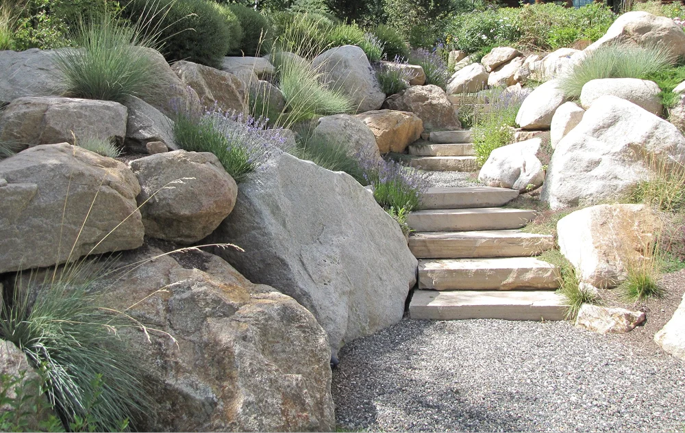 - Укрепление склонов. Камни и растения помогают закрепить почву на неровной местности, предотвратить ее осыпание и размывание от дождей.