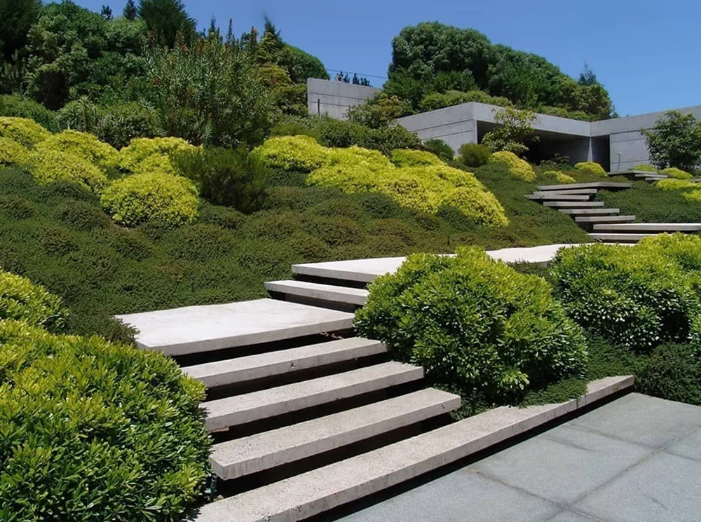 Элементы, служащие переходом между уровнями. Могут быть как крутыми, так и пологими, с подпорными стенками, лестницами и растительным оформлением.