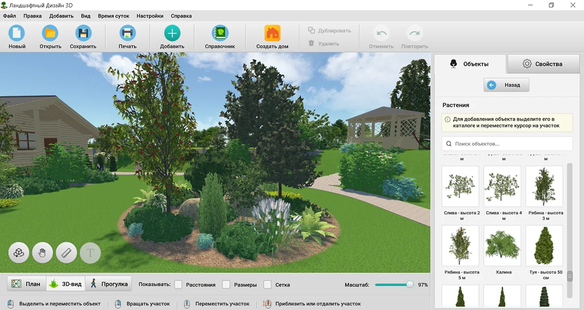 Перед началом земляных работ нужно составить проект — это поможет избежать ошибок в масштабе, расчете объемов грунта и расположении элементов ландшафта. Удобно сделать визуализацию и чертеж в одной программе. В ПО Ландшафтный Дизайн 3D получится: