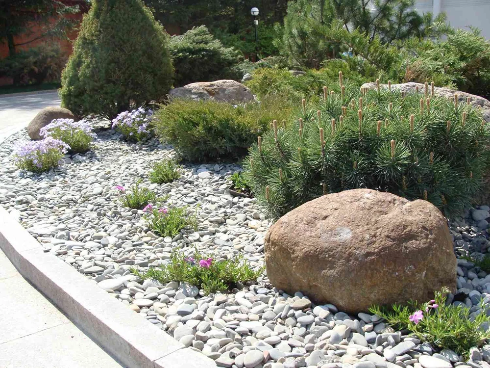 Гравий, щебень, галька или каменная крошка применяются в рокариях, альпинариях и современных ландшафтных композициях. Прекрасно выглядят, долго сохраняют форму, не нуждаются в обновлении, только в периодической подсыпке. Хорошо пропускают воду и защищают почву от перегрева.