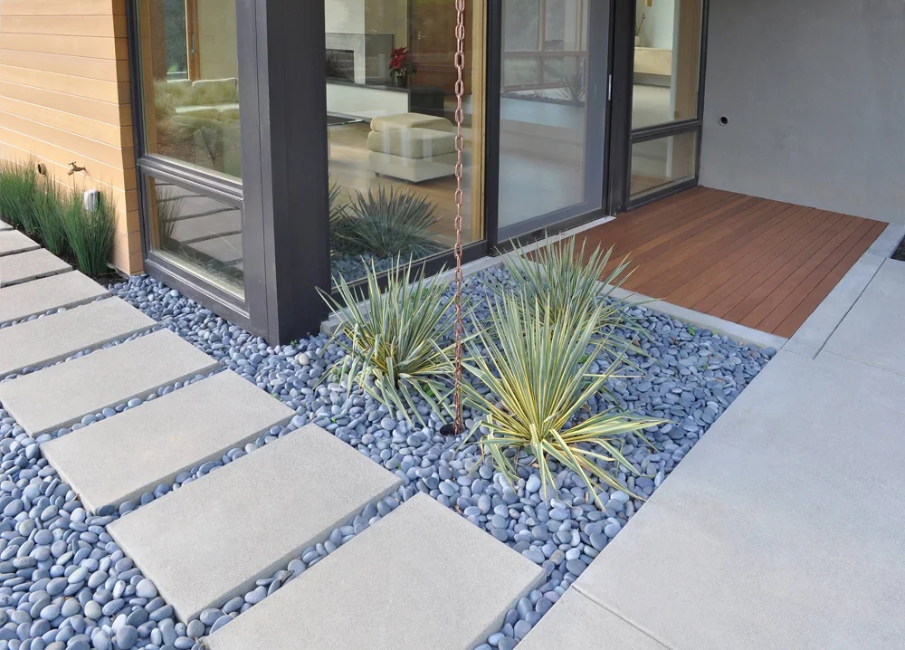 Придает посадкам ухоженный и аккуратный вид. Светлые камни — гравий, мраморная крошка — красиво контрастируют с зеленой листвой.