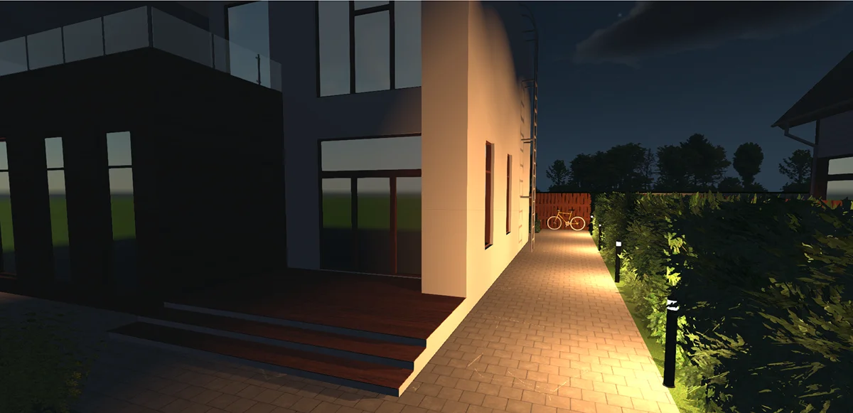 - возможность моделировать рельеф участка, настраивать время суток и положение