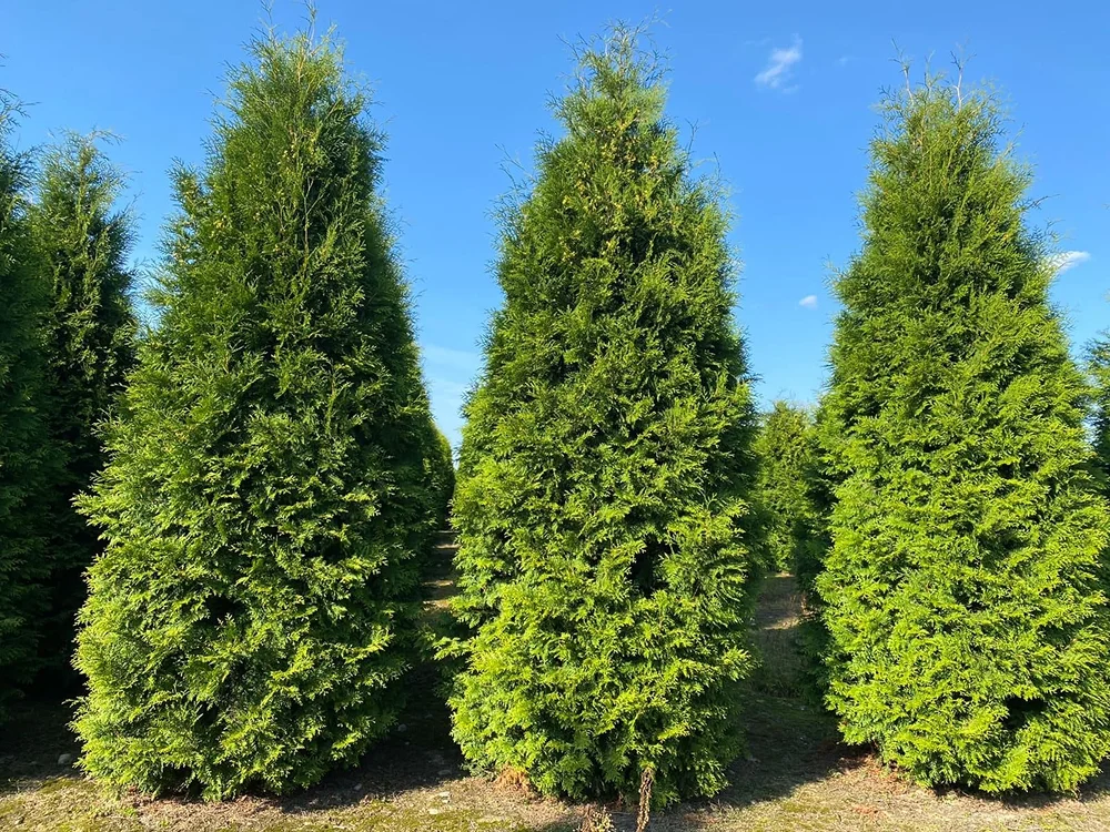 - Туя западная Смарагд — плотная колонна, аккуратная классика для ровной зеленой стены.
