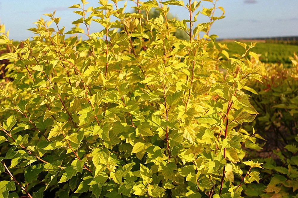 - Пузыреплодник Диабло или Дартс Голд — быстрорастущие декоративные кустарники с бордовой и желтой листвой.