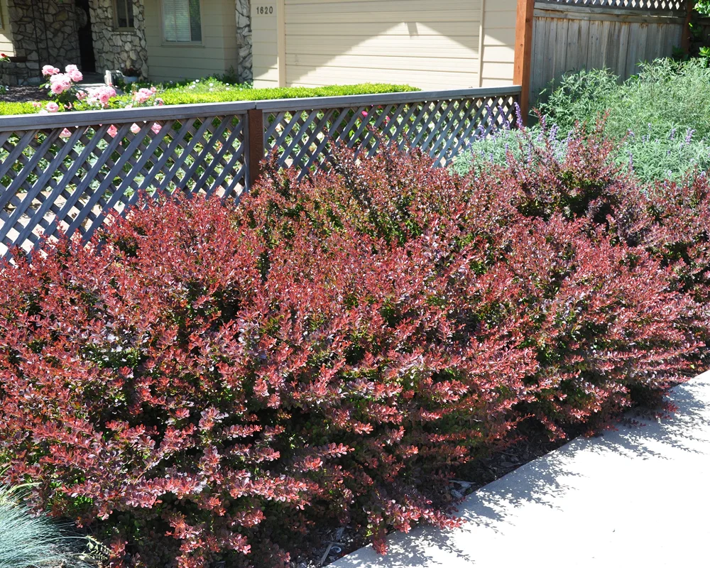 - Барбарис Тунберга привлекает внимание эффектными листьями, поддается формовке и вписывается в современные ландшафты.