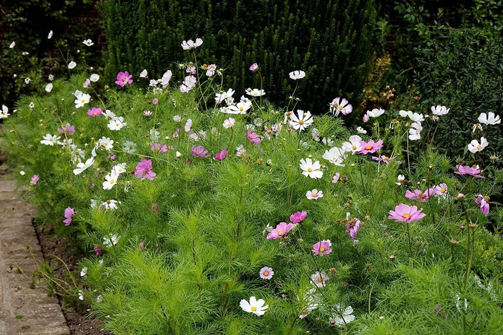 - Космея с воздушной листвой и цветками дополнит природные ансамбли.