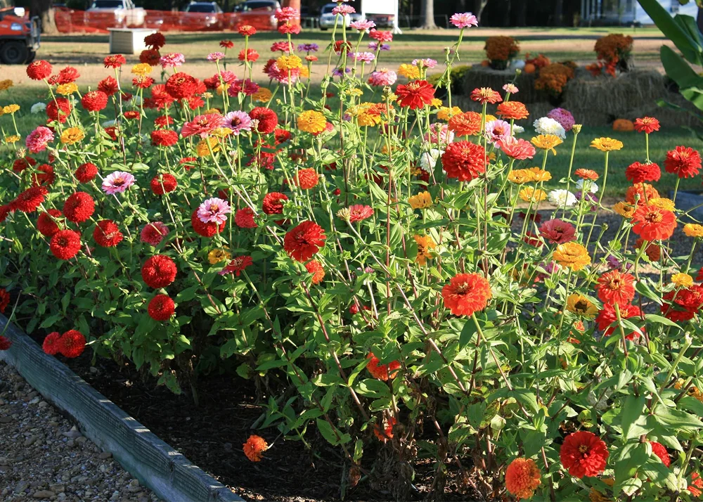 - Цинния с крупными цветками-шапками хорошо смотрится в классических садовых ансамблях.